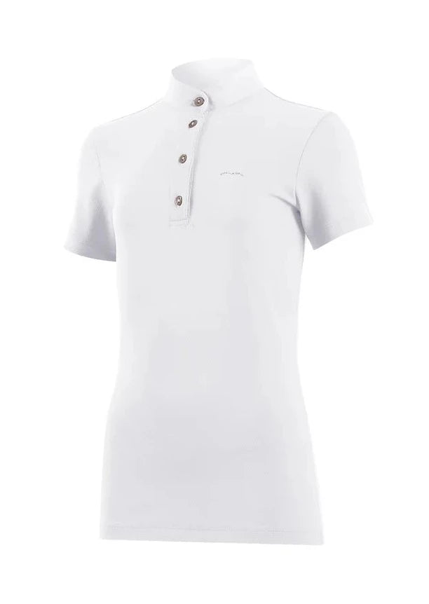 Animo Tävlingstopp Betta är tillverkad av högkvalitativt tekniskt material som är både andningsbart och fuktavvisande, vilket håller dig bekvämt sval och torr under de mest intensiva tävlingsdagarna. Men det är inte bara materialet som är imponerande - toppen har också Animos ikoniska Swarovski-logotyp på bröstet som ger en extra touch av stil och elegans.