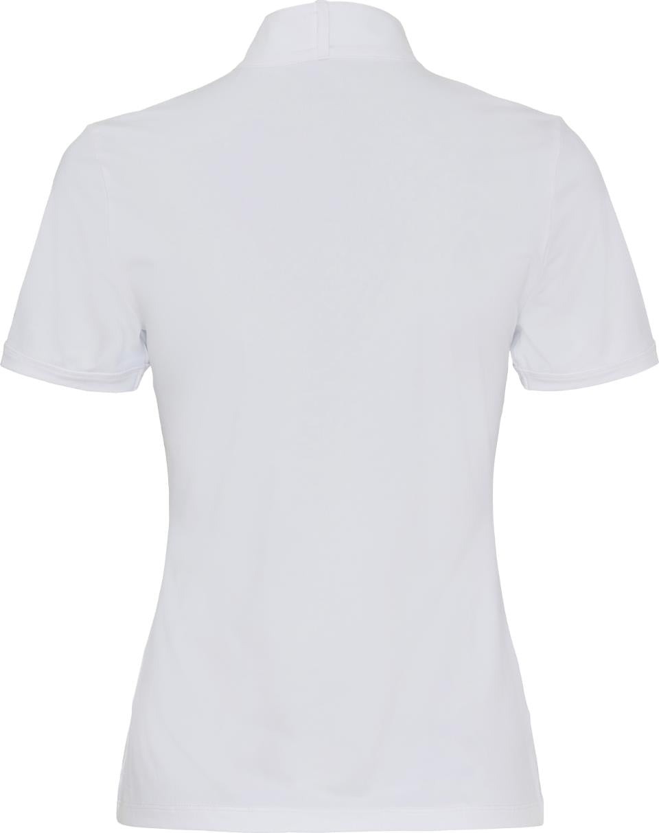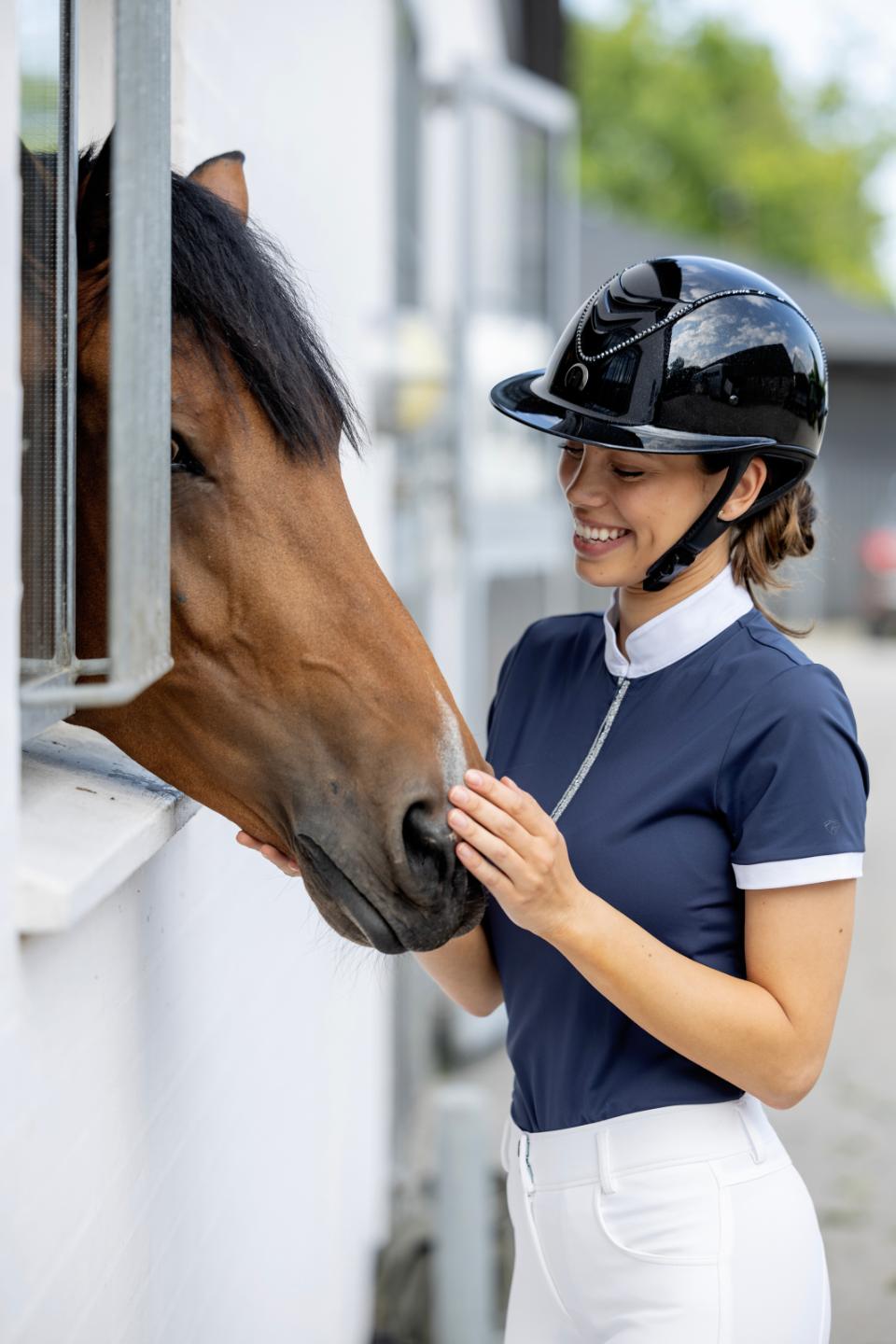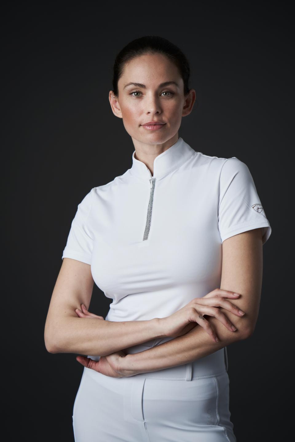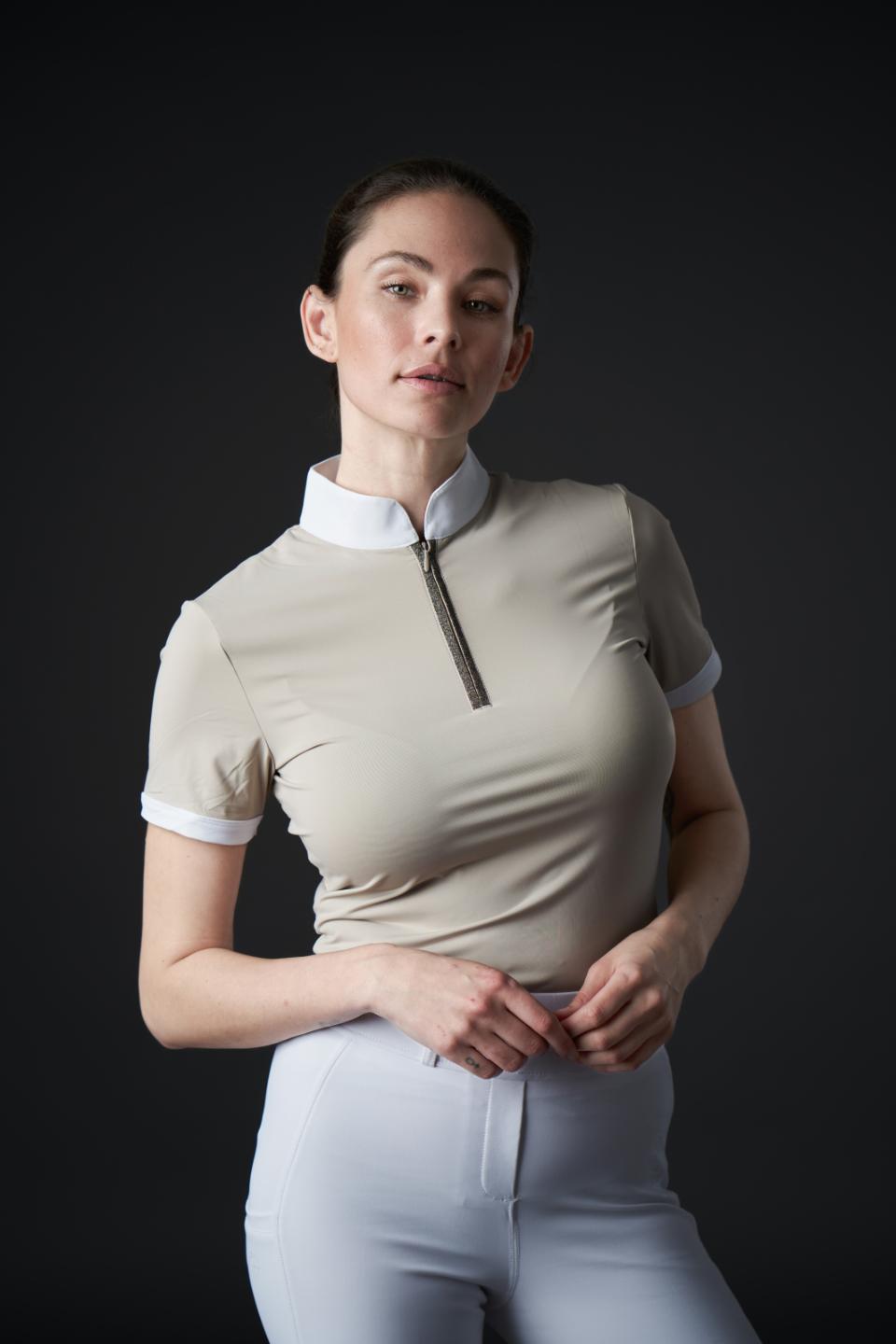 En kortärmad, figurnära blus med hög krage som passar lika bra till tävling som till vardags. De vita kantbanden vid ärmsluten och den vita kragen ger ett rent och elegant uttryck. Den främre dragkedjan är dekorerad med kristaller som tillför en diskret och stilfull glans.