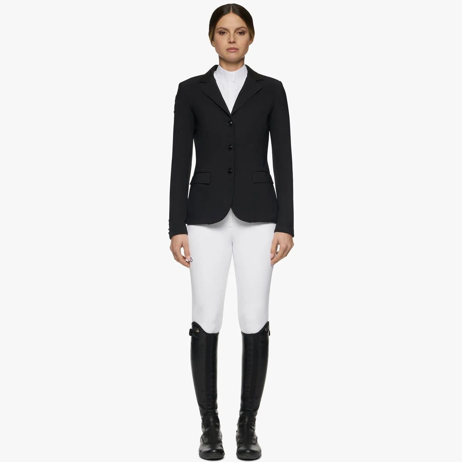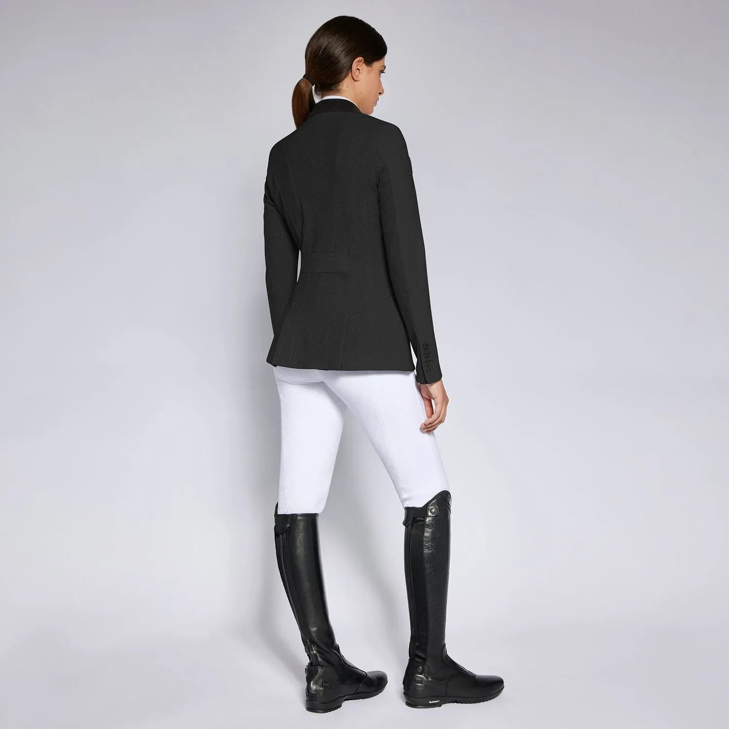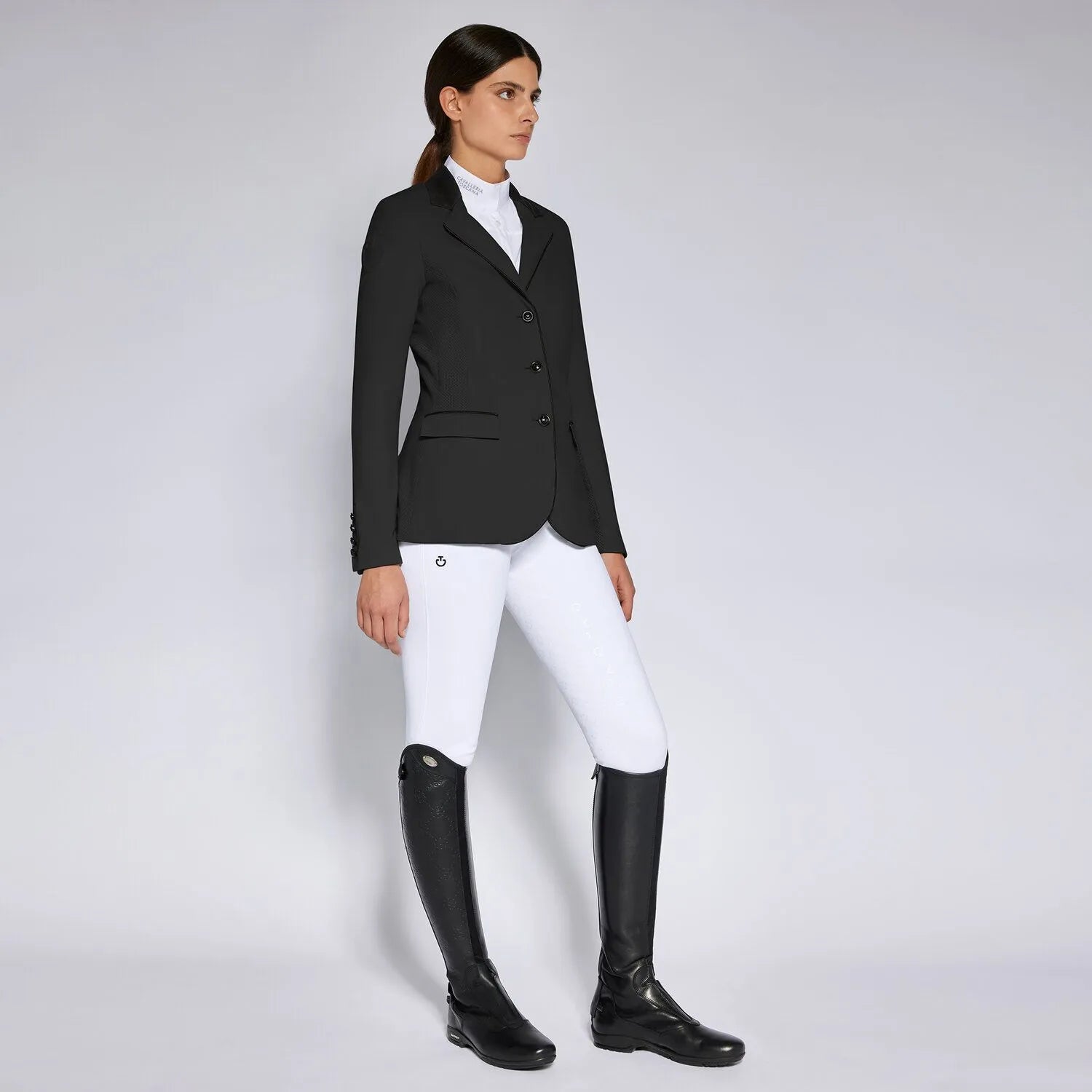 Prestation möter stil på tävlingsbanan med Cavalleria Toscana. Den här damkavajen är tillverkad i ett specialutvecklat funktionsmaterial som stretchar i fyra riktningar, med perforerade paneler på sidorna för optimal ventilation. Den klassiska, skräddarinspirerade passformen har formande insnitt fram och bak för en elegant siluett. Kontrasterande passpoaler längs öppningen och fickorna samt en krage i avvikande färg ger kavajen ett distinkt och exklusivt uttryck.