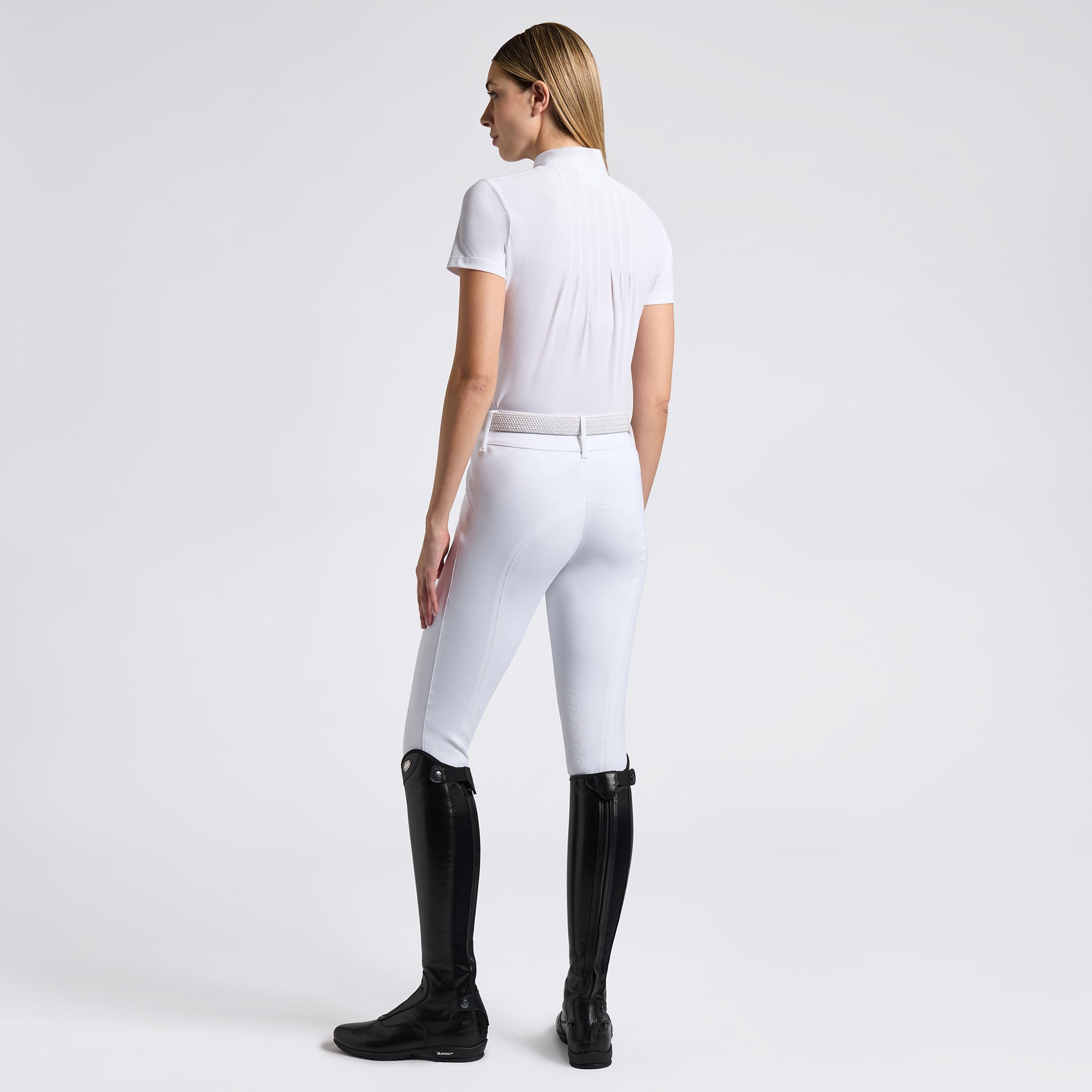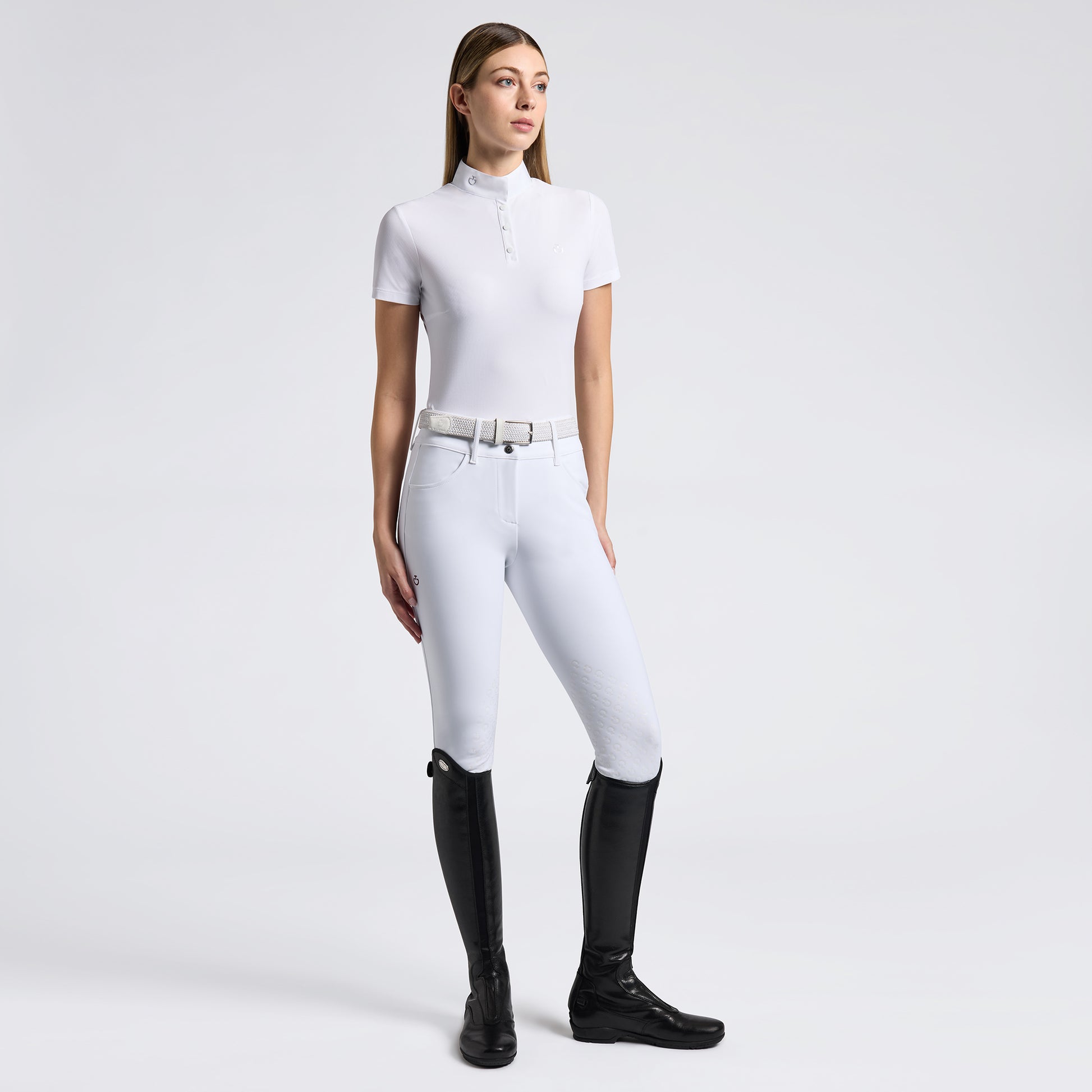 The Cavalleria Toscana women's short-sleeved competition shirt is an elegant and functional garment, perfect for formal events. Made from lightweight technical jersey, it ensures comfort and breathability during activity. The design features a white poplin collar and hidden snap buttons, offering a refined and polished look. The thermo-applied embossed logo adds an exclusive detail, making this shirt the ideal choice for riders seeking a combination of style and performance.