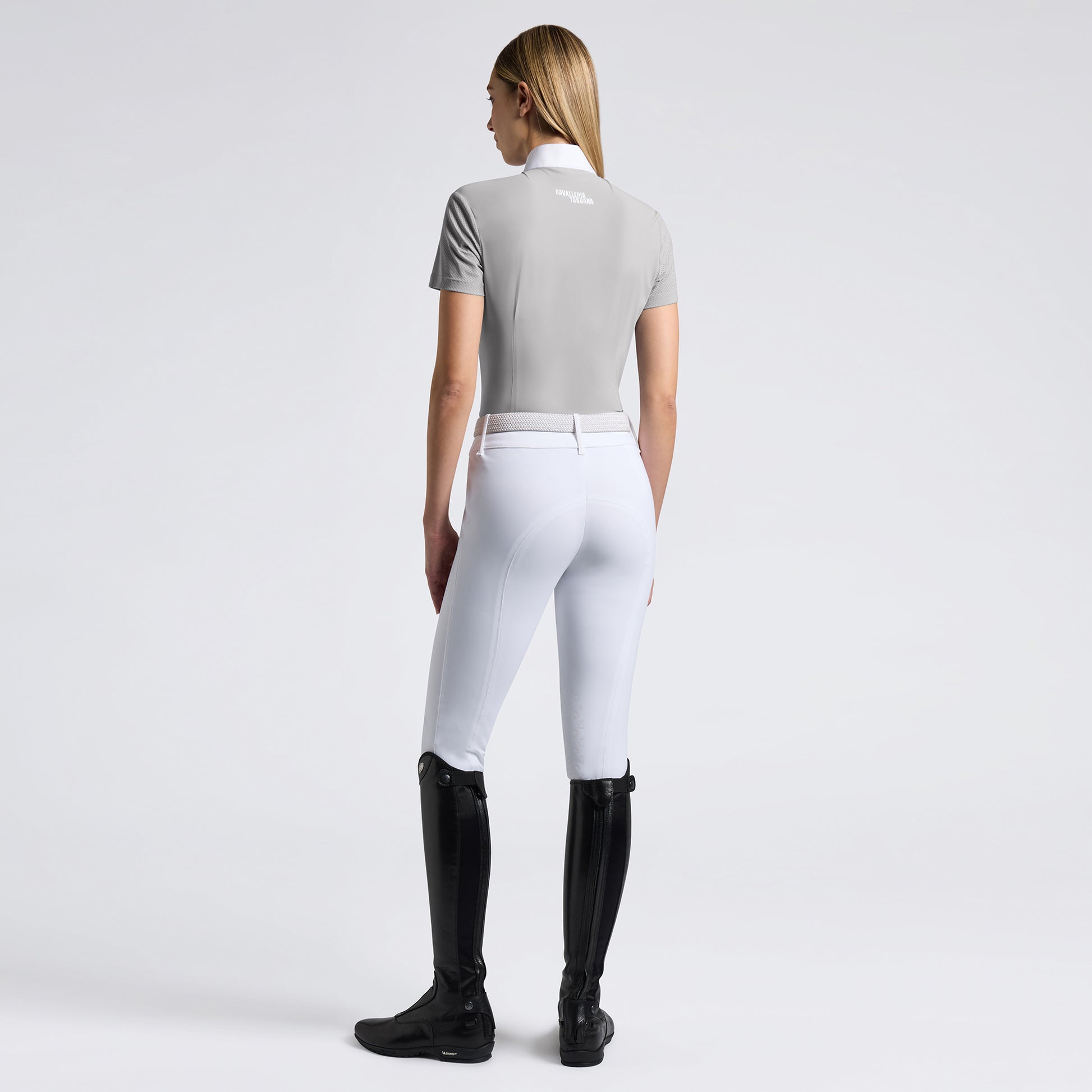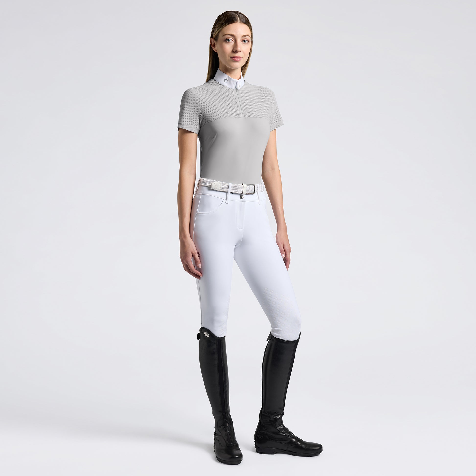 The Cavalleria Toscana women's short-sleeved competition shirt is designed to deliver high performance and impeccable style. Made from lightweight technical fabric with perforated jersey inserts, it ensures excellent breathability and comfort during competitions. The white poplin collar and invisible zipper add elegance and practicality, while the thermo-applied embroidered logo on the back and collar provides a distinctive touch. With its ergonomic cut and high-quality materials, this shirt is the perfect choice for riders seeking a functional and refined garment.