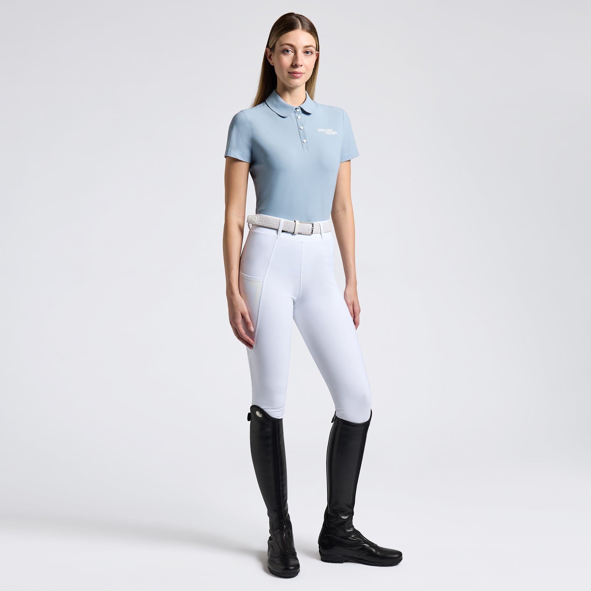 The Cavalleria Toscana women's technical polo is perfect for riders who seek a blend of elegance and performance. Made from lightweight and breathable jersey fabric, it ensures maximum comfort during training or competitions. The design is enhanced by front snap buttons and a high-definition embossed Cavalleria Toscana logo, adding a touch of sophisticated style. Available in versatile shades, it pairs seamlessly with any equestrian outfit, offering an impeccable fit and freedom of movement for all disciplines.