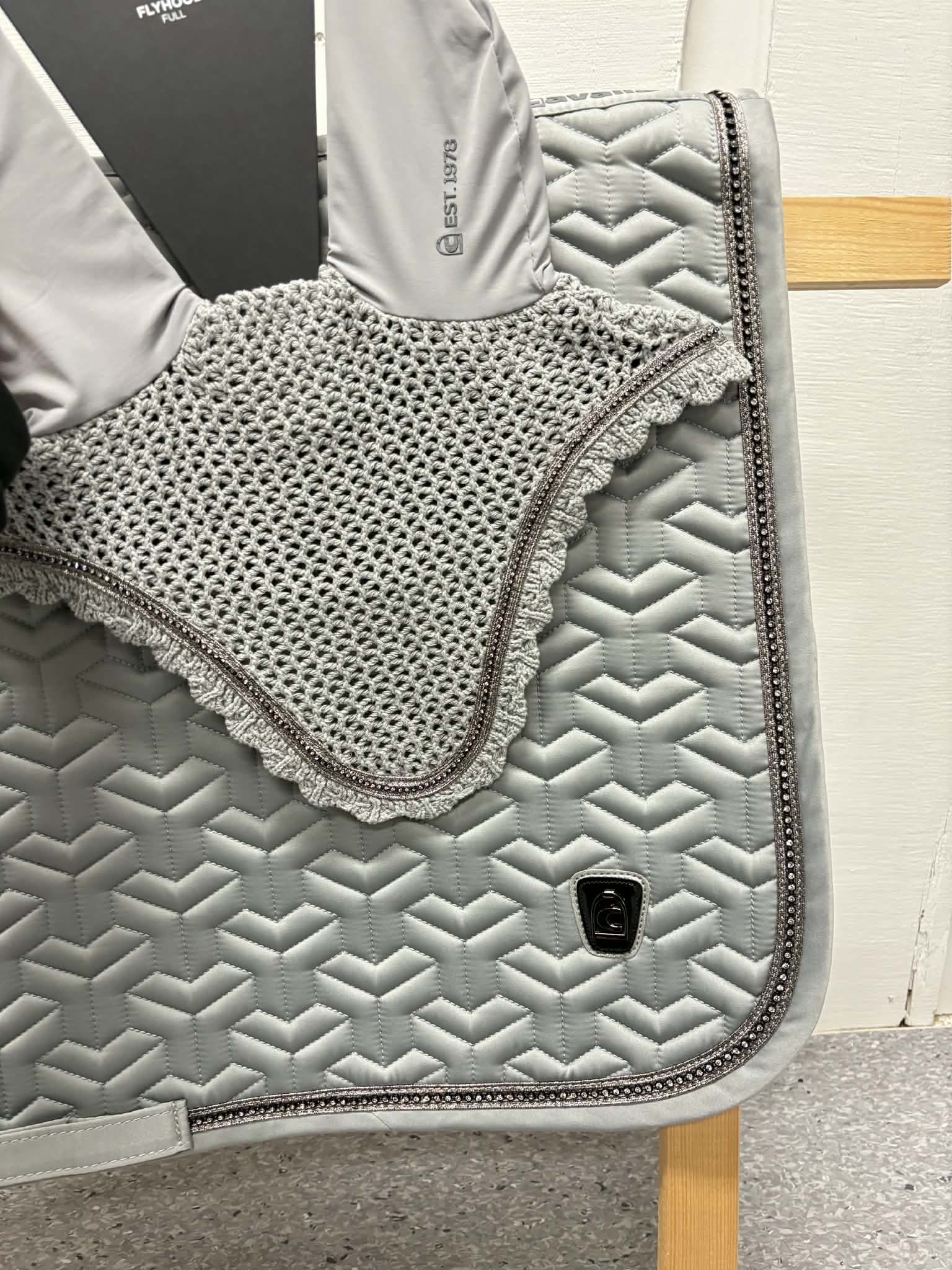 Schabrak med ett avancerat, grafiskt quiltat mönster som ger ett exklusivt och stilrent uttryck. Det glänsande yttertyget bidrar till ett elegant utseende, och mellan de dubbla banden längs kanten löper ett kristallband som ramar in schabraket på ett perfekt och ögonfångande sätt. På bakkanten pryds schabraket av en högkvalitativ Cavallo-logga i gunmetal-look för ett extra lyxigt intryck.