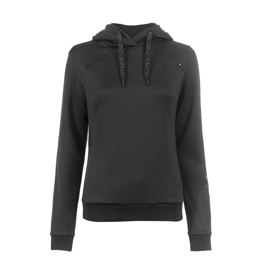 En avslappnad sweatshirt tillverkad i funktionellt material som ger både komfort och rörelsefrihet. Huvan kan fästas baktill med en tryckknapp och har en ton i ton snörning dekorerad med gnistrande kristallstenar.