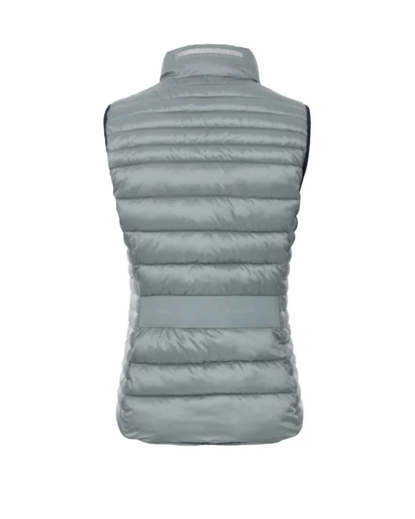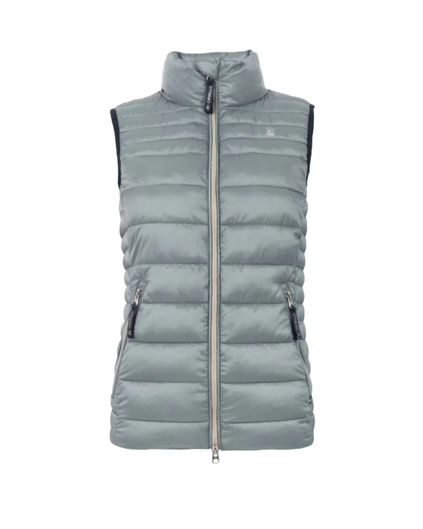 Väst i glansig quiltad design från Cavallo. Stå-krage och formsydd midja. 2-vägs dragkedja, två fickor fram och innerficka. Cavallos logga på baksidan av kragen, under dragkedjan och på de dekorativa elastiska banden i ryggen som också ger en snygg passform.