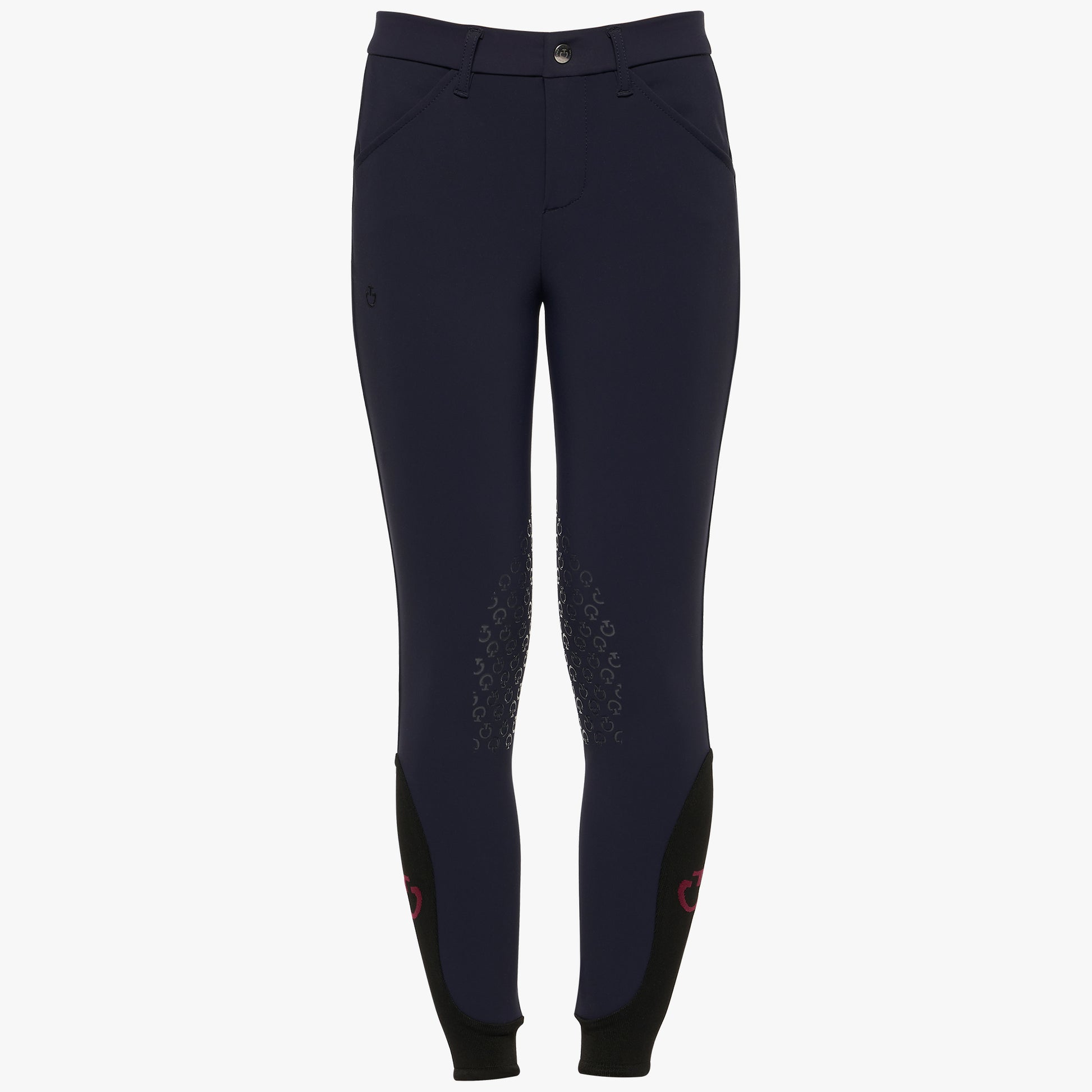 Performance breeches in four-way-stretch fabric with ergonomic seams and logo-shaped, silicone grip details.