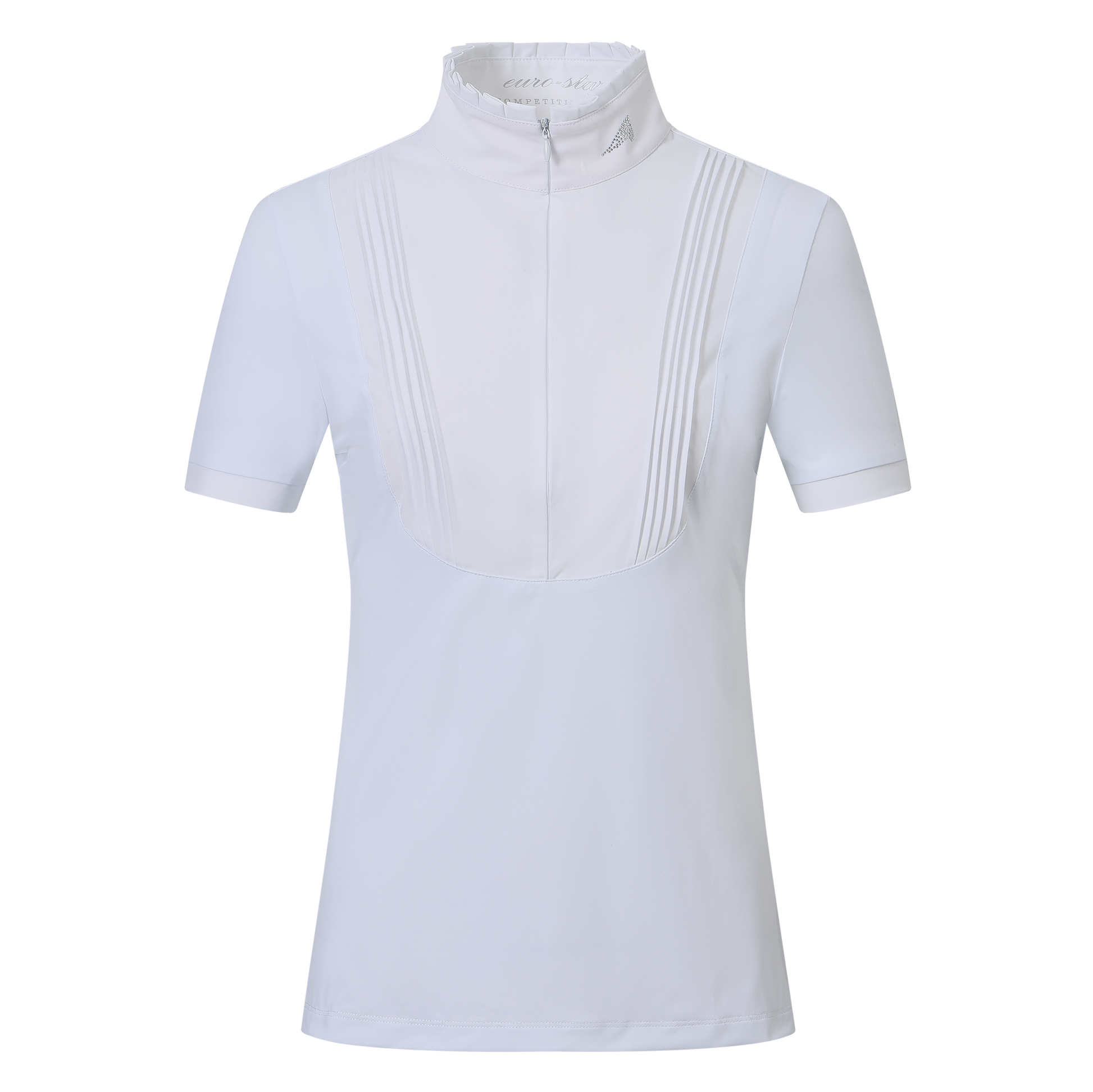 Den dekorativa framdelen med subtila veck skapar ett raffinerat intryck, medan de korta ärmarna med små manschetter tillför en stilfull finish. Kragen pryds av en diskret volangdetalj som ger en feminin touch – perfekt för ryttare inom både dressyr och hoppning.