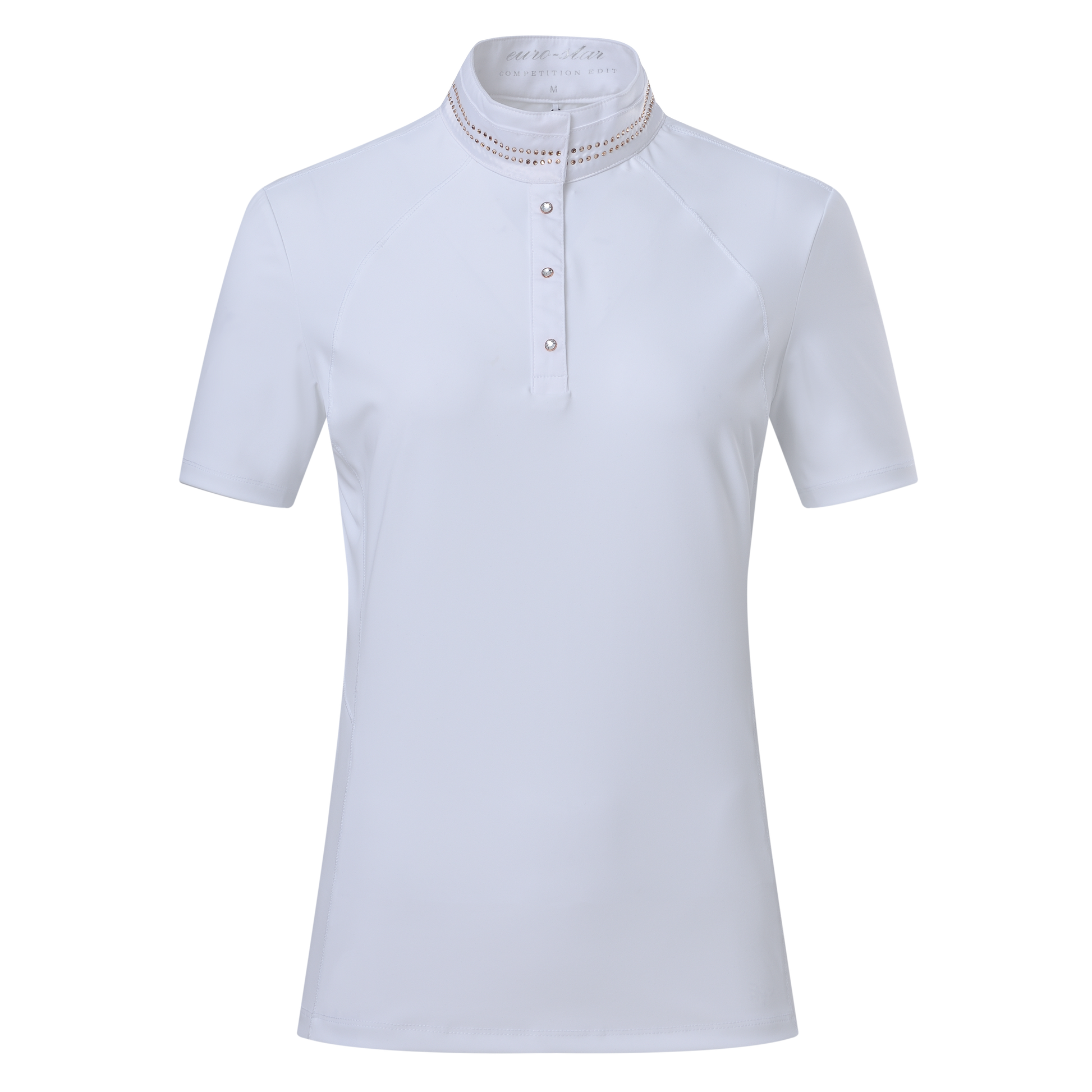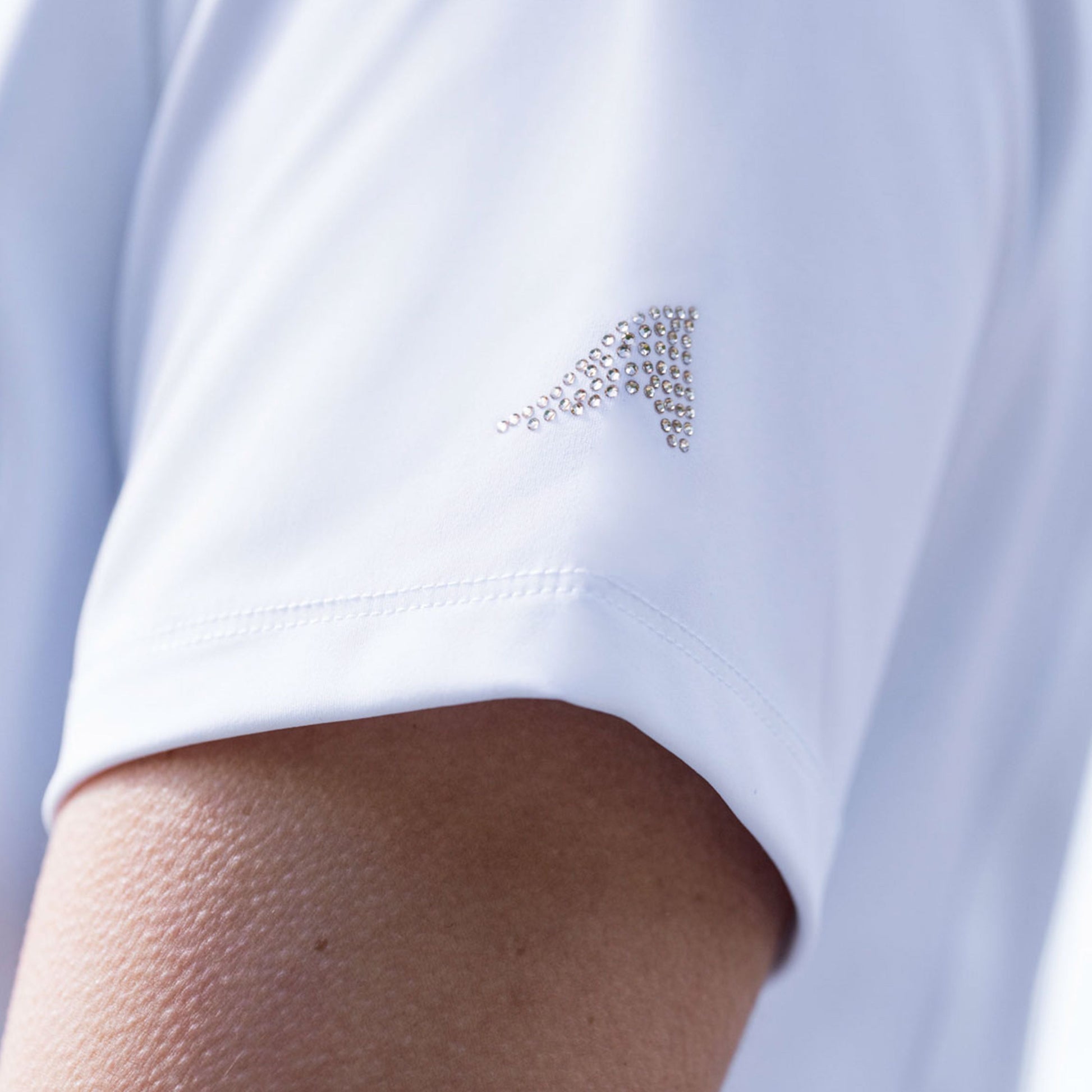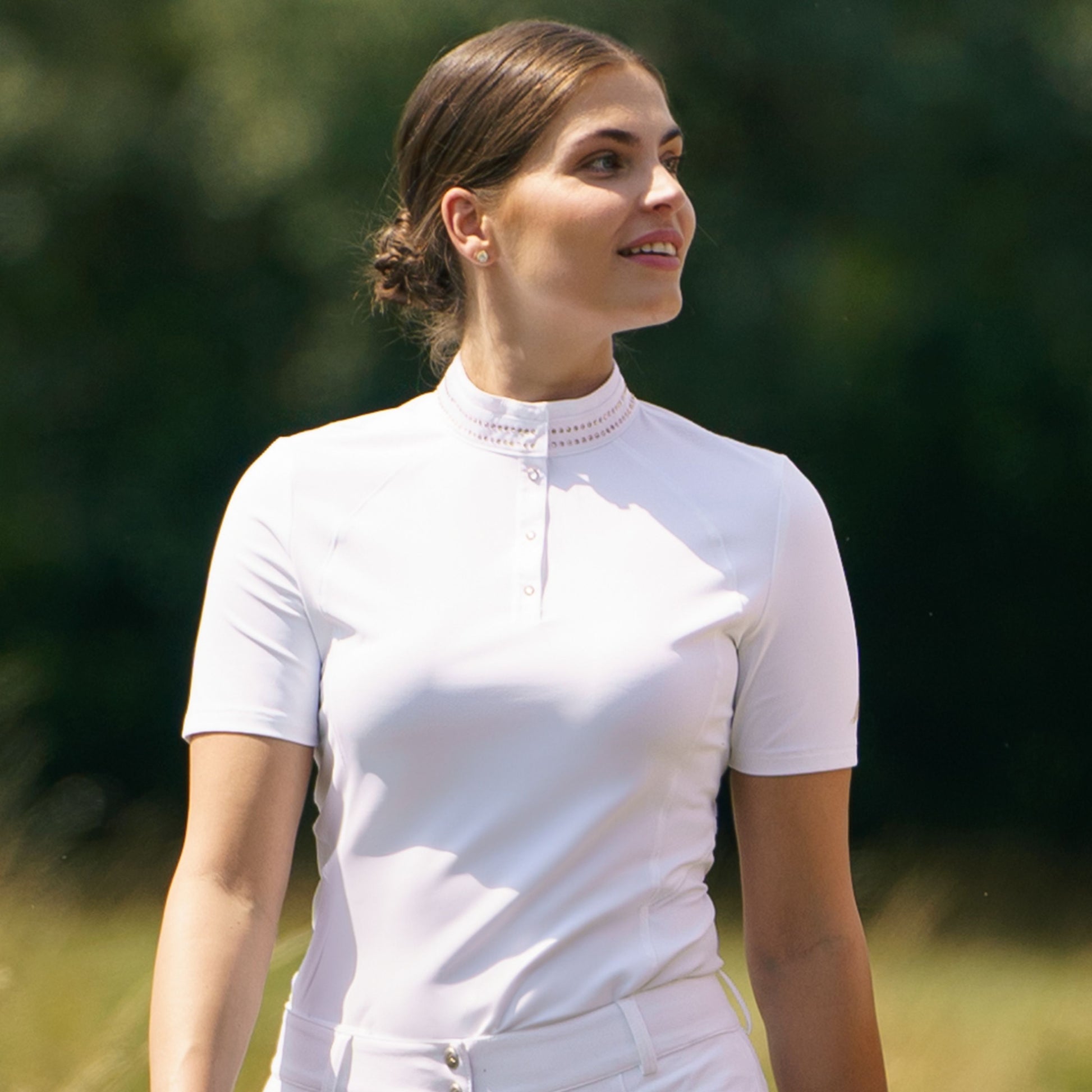 De figursmickrande och sofistikerade linjerna framhäver en slank siluett och får dig att känna dig redo för varje dressyr- eller hopputmaning. Skjortans största juvel är den exklusiva kragen, vackert dekorerad med glimrande strass som ger en perfekt touch av glamour. De diskreta tryckknapparna och den dolda dragkedjan bak skapar en stilren och elegant finish.