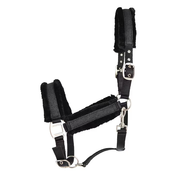 Hnasbo sport grimma Ylva, en glamorös grimma med glittriga dekorband, tillverkad av kraftig grå textil med mjuk petrolfärgad syntetpäls i nacke, nos och på sidostyckena. Justerbar för optimal passform