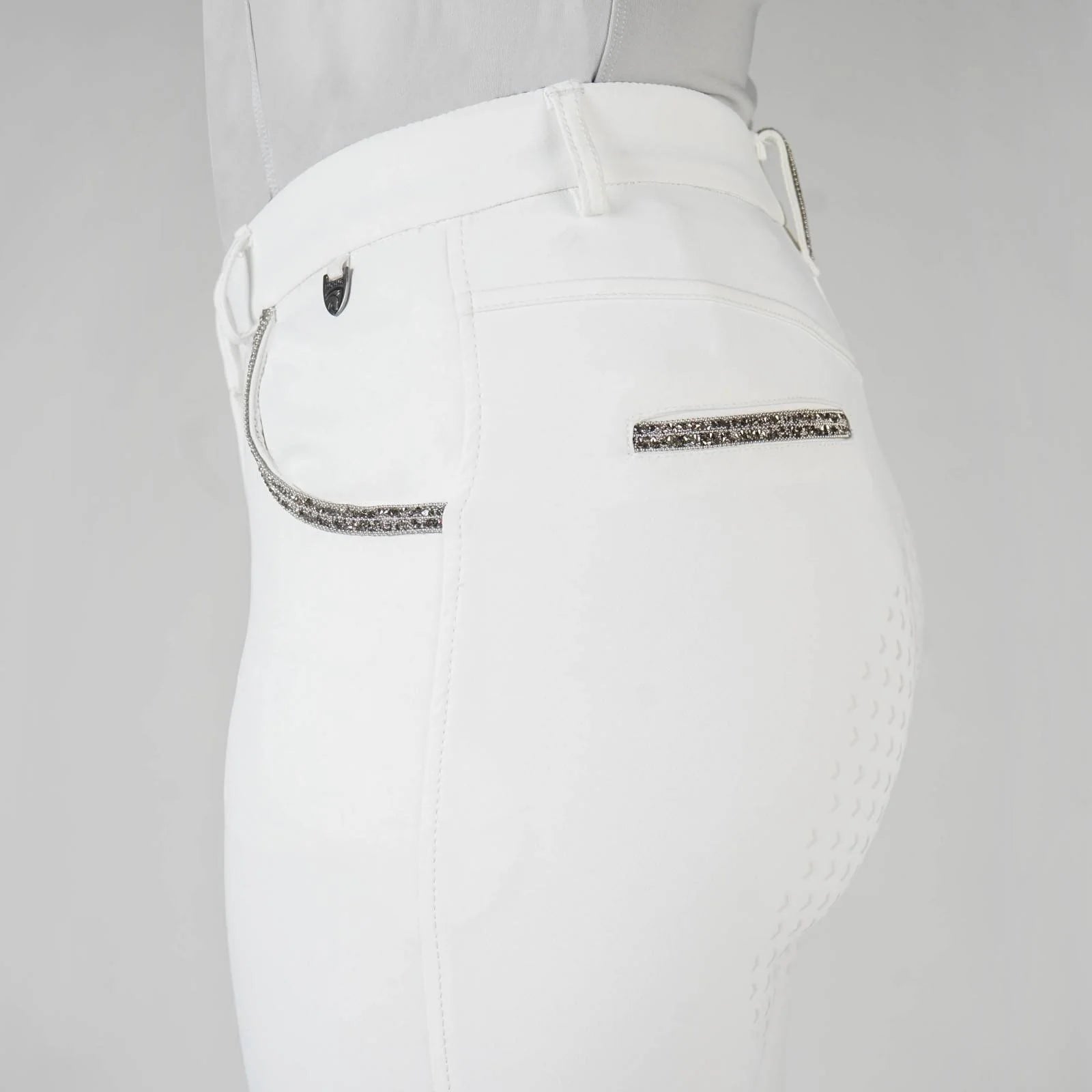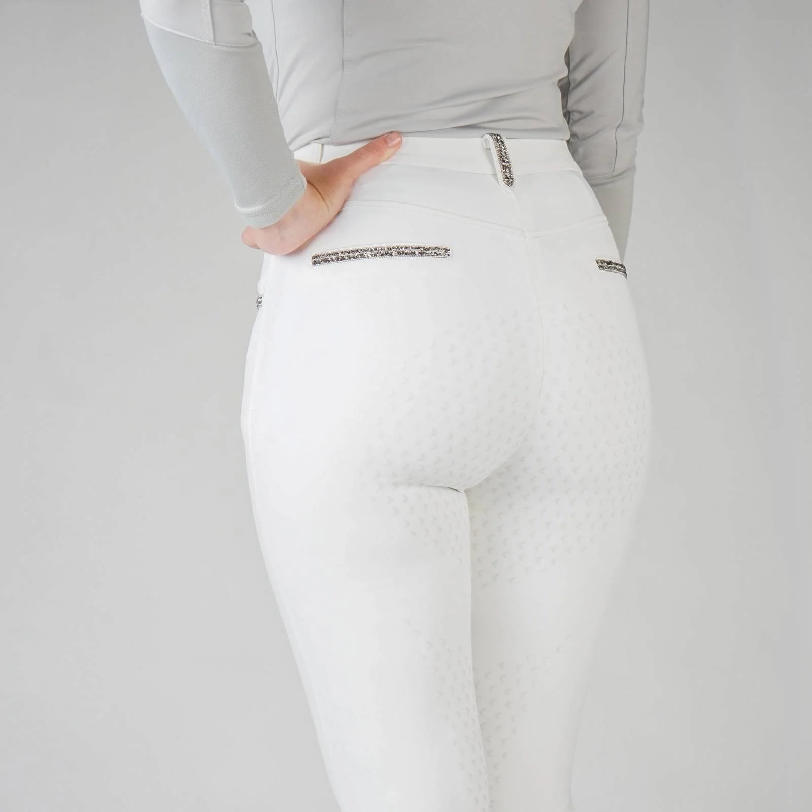 Glittrande band på de bakre hällorna samt vid fram- och bakfickorna ger en sofistikerad touch, medan de diskreta matta silikonpanelerna i sätet ger stabilitet och grepp utan att kompromissa med stilen. De djupa framfickorna rymmer en mobiltelefon, vilket gör byxorna både praktiska och stilrena – perfekta för en snygg framtoning på tävling.