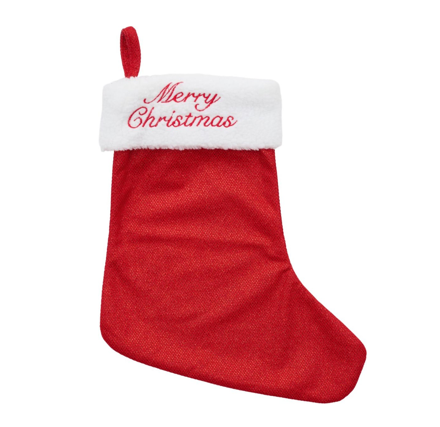 Glittrig julstrumpa med Merry Christmas broderi och luddig vit kant som hjälper till att få rätt julstämning i stallet eller fylla med julgodis. Rem upptill gör att den passar att hänga upp på de flesta ställen.