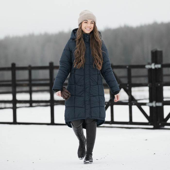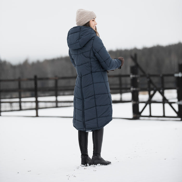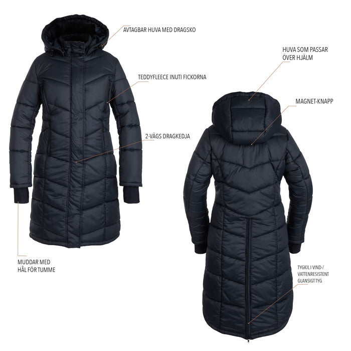 Varmfodrad ridkappa i vindtätt och vattenavvisande material. Bonita är en ridkappa med många smarta och genomtänkta detaljer – bland annat rejäl tvåvägsdragkedja framtill, innerficka och två framfickor med dragkedjor. I båda fickorna finns dessutom ett infällt band med reflexband som enkelt kan fällas ut vid behov – perfekt för ökad synlighet i mörker. Ärmsluten har smidiga muddar med tumhål, och baktill finns ett dragkedjeförsett sprund med en rejäl kil och reflexband. Kappan har justerbara benband på insidan som håller den på plats under ridning. Den avtagbara och justerbara huvan är utformad för att även kunna bäras över hjälm, och en magnetknapp på ryggen håller huvan snyggt på plats när du rider. Innerfodret har ett diskret Horse Life-mönster och detaljer som HL loggo-pullers på dragkedjorna. Bonita finns för både dam och junior. 100% polyester
