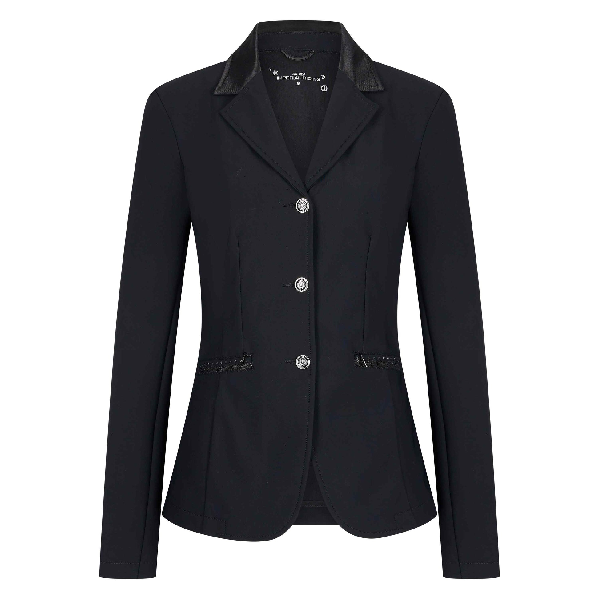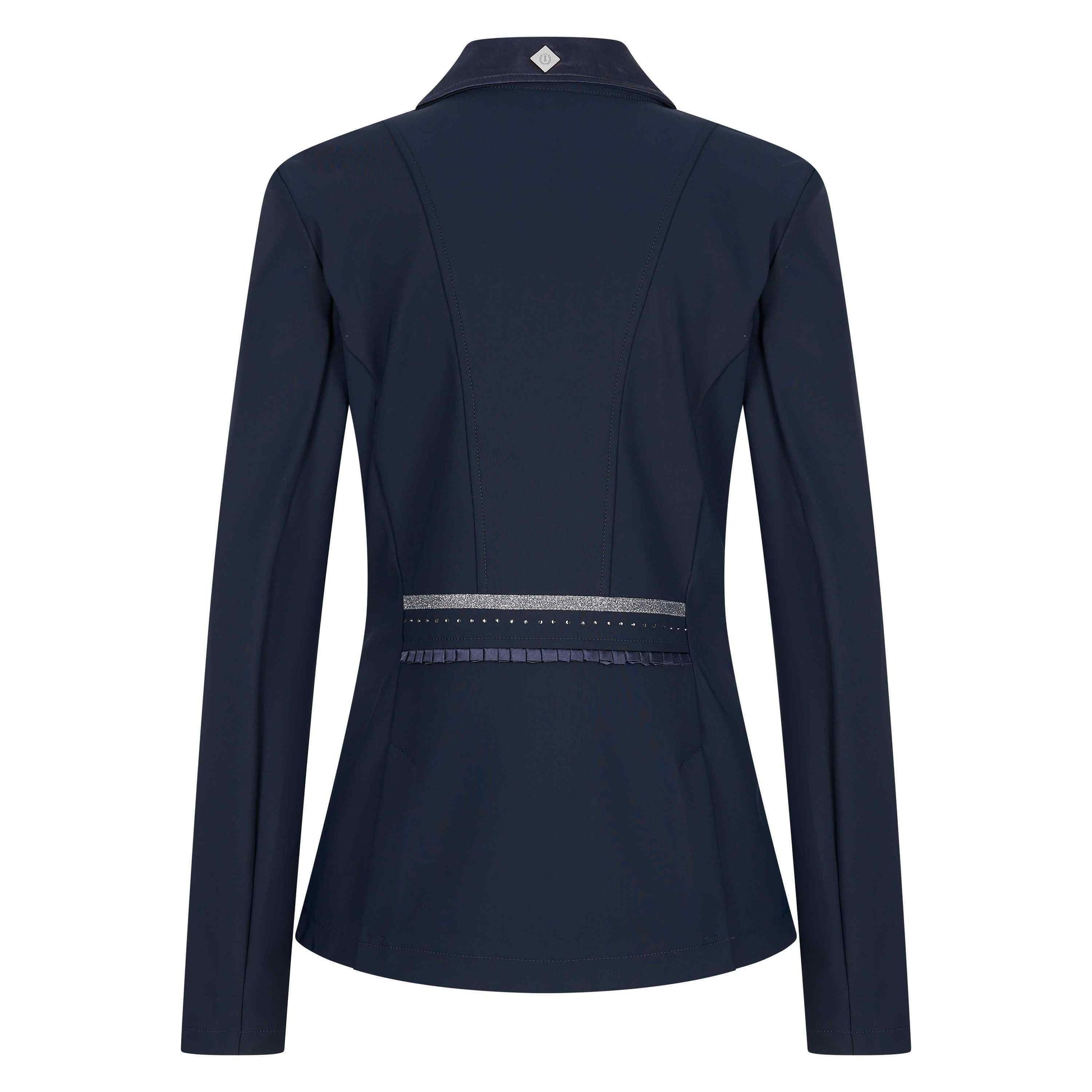 Baksidan är designad med midjesöm och glitterband, samt två slitsar som skapar en smickrande silhuett och optimal rörlighet i sadeln. På mitten av ryggen finns ett exklusivt rhinestone-logotryck, och på vänster ärm ett gnistrande IMPERIAL RIDING-rhinestonemotiv som ger kavajen en tydlig premiumkaraktär.