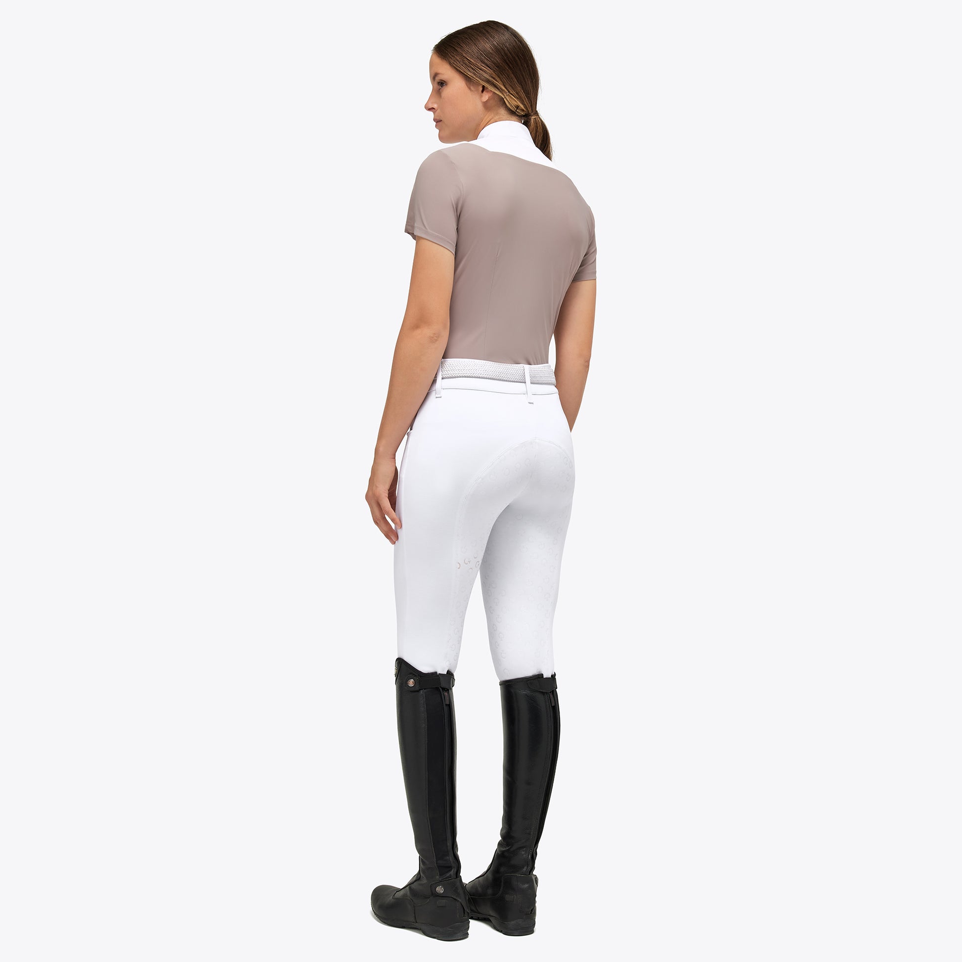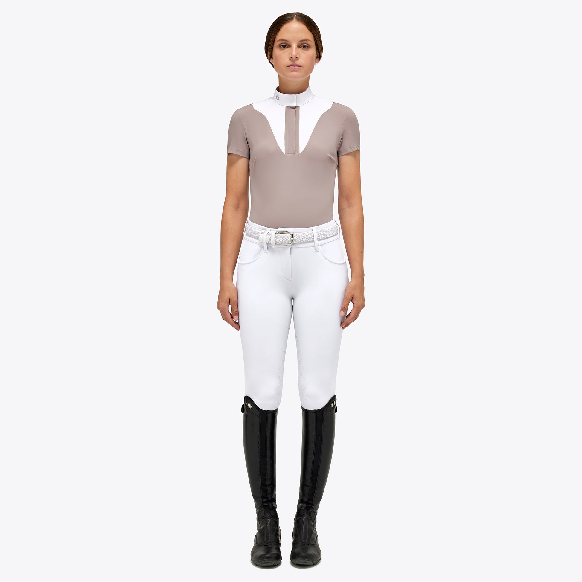 Update your horse show wardrobe with the geometric allure of this competition shirt. Its impeccable fit accents the waistline, while the supple performance jersey fabric stretches in all four directions to ensure maximum freedom of movement. It’s distinguished by the geometric shape of the bib and the embroidered CT logo on the stand collar.