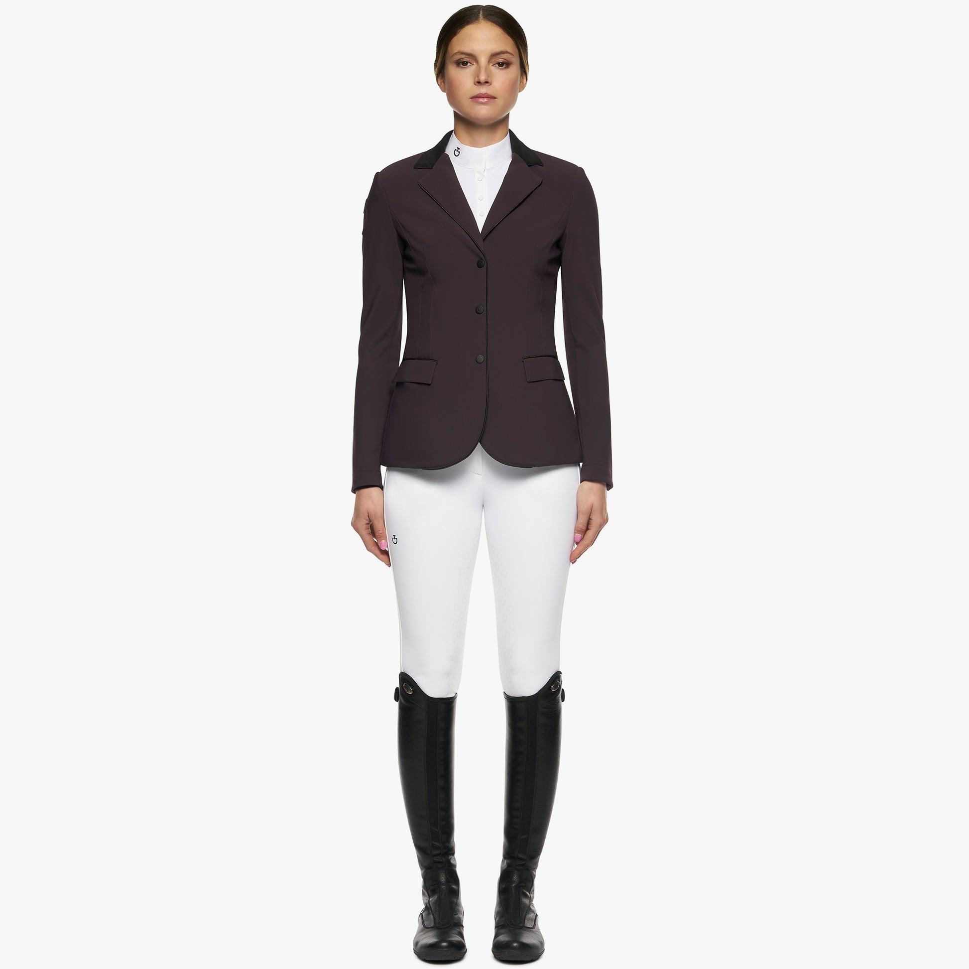 Cavalleria Toscana tävlingskavaj för dam har en klassisk, figursydd design som förfinas av en elegant krage och kontrasterande alcantaradetaljer. Kavajen har två framfickor, treknappsstängning med dold dragkedja samt en diskret präglad logotyp på axeln. Den eleganta silhuetten kombineras med ett tekniskt 4-vägsstretch-jersey som ger utmärkt andningsförmåga och vattenavvisande egenskaper. Passformen följer kroppens rörelser perfekt och erbjuder både komfort och stil i sadeln.