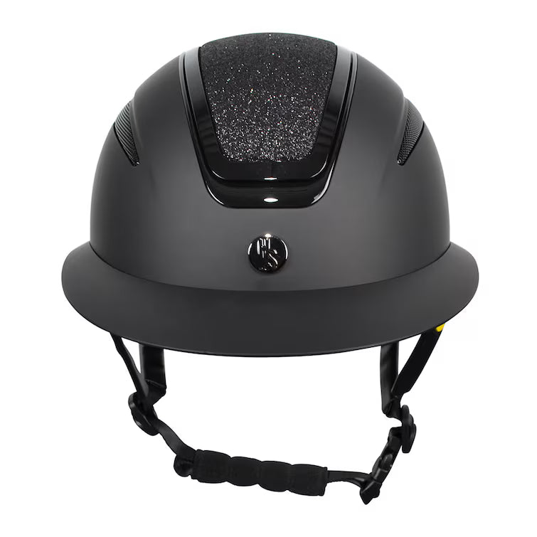 Ridhjälm med implementerat Mips-system. Elegant bred, matt solskärm, glittrande panel kantad av en stilfull cromad ram i symbios med matt omringande detalj. Designad med fyra funktionella ventilationsöppningar. Justerbart hakband med detaljer av syntetiskt läder och praktiskt snabbspänne. Avtagbart vadderat innerfoder av Cooldry-material, torkar snabbt och håller huvudet svalt under hela ridpasset. Justerbart huvudband för optimal passform.