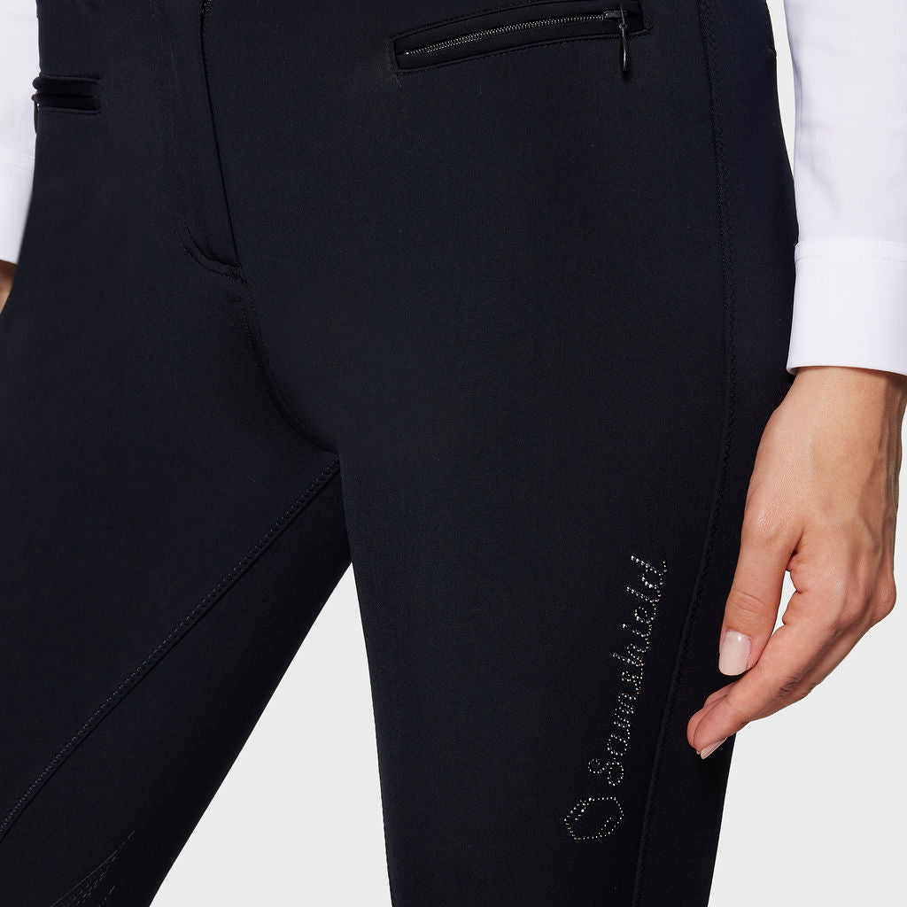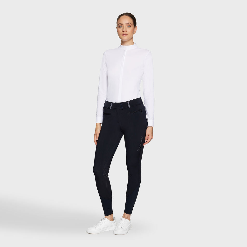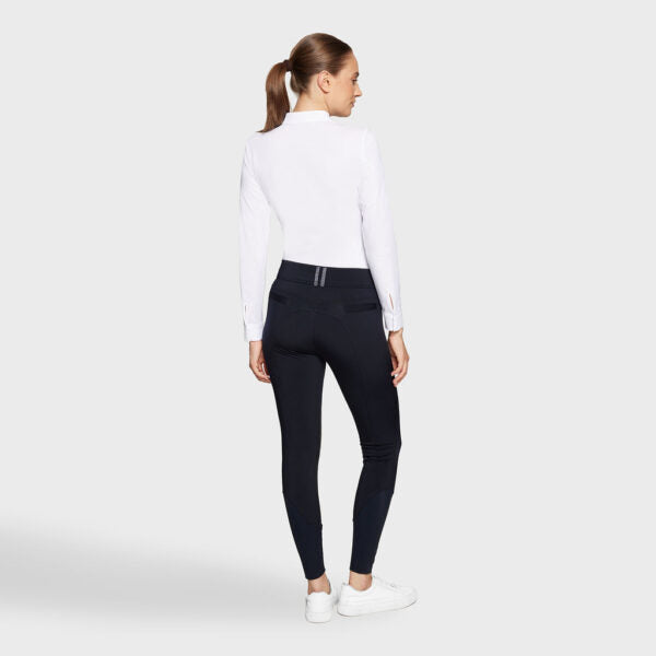 Ridbyxorna har en praktisk framficka för mobilen, ett komprimerande vadparti som främjar blodcirkulationen samt en invändig elastisk panel som håller tröjan på plats under ridning.