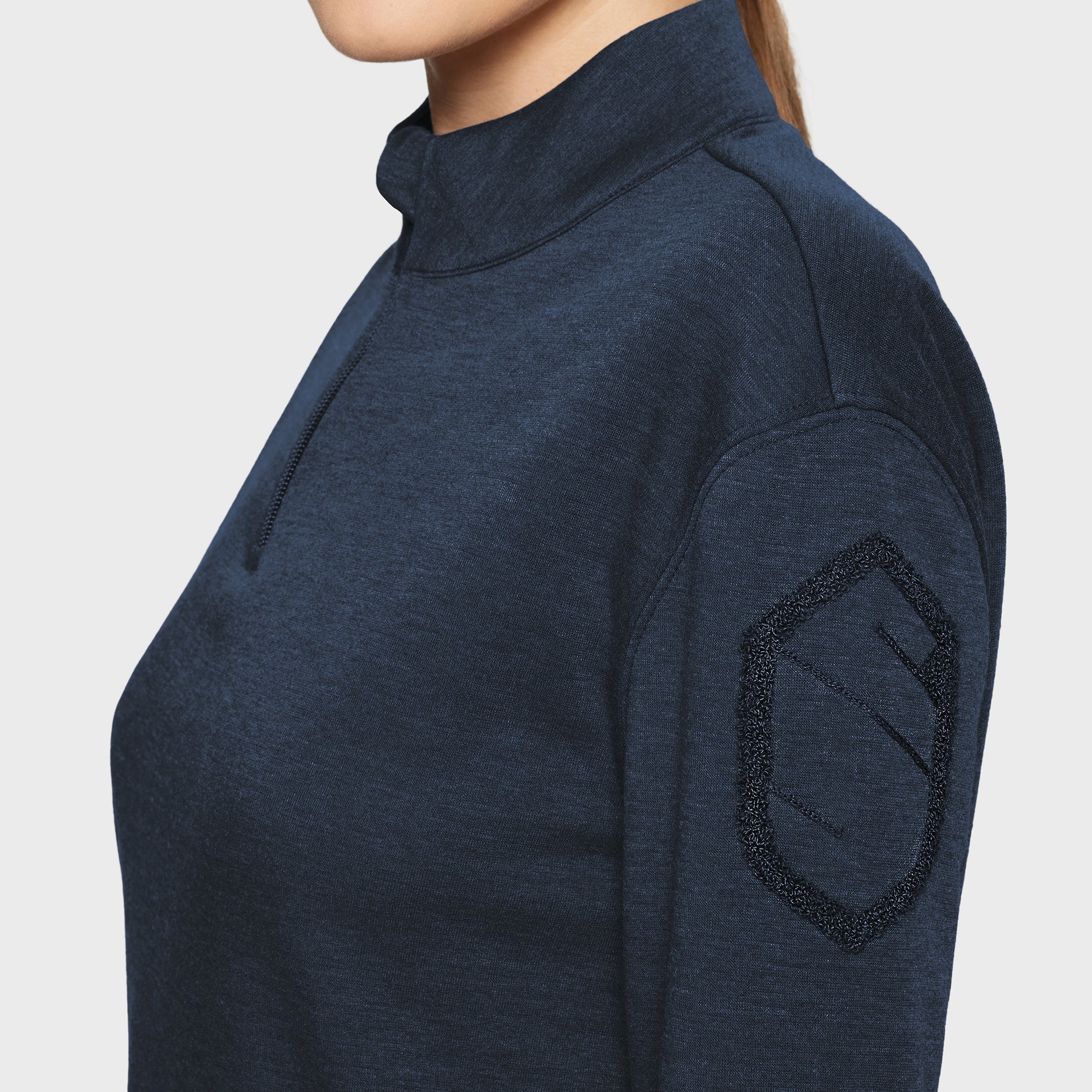 Tröjan har en minimalistisk look med ståkrage, halvlång dragkedja och långa ärmar. På ärmen finns Samshield-emblemet som en diskret detalj, och tröjan är försedd med vindtäta paneler och justerbara dragsnören för extra skydd och komfort.