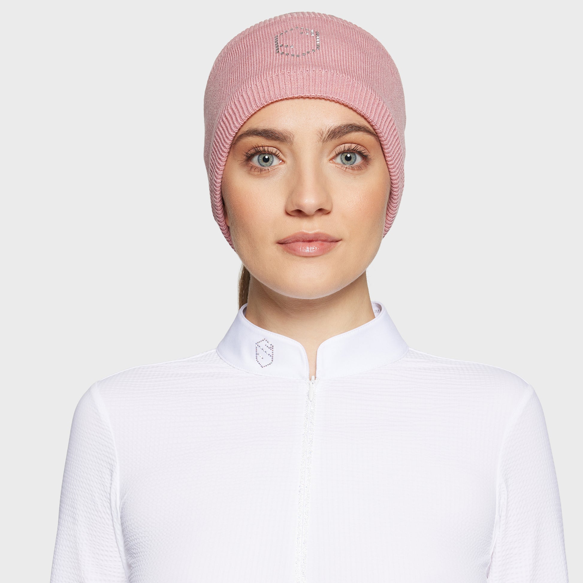 Pannbandet har en elastisk, ribbstickad kant och är tillverkat i Half Cardigan-stickning som ger en fin textur och formstabil passform. Framtill pryds det av Samshield-emblemet dekorerat med Swarovski®-kristaller som tillför en diskret men exklusiv glans.