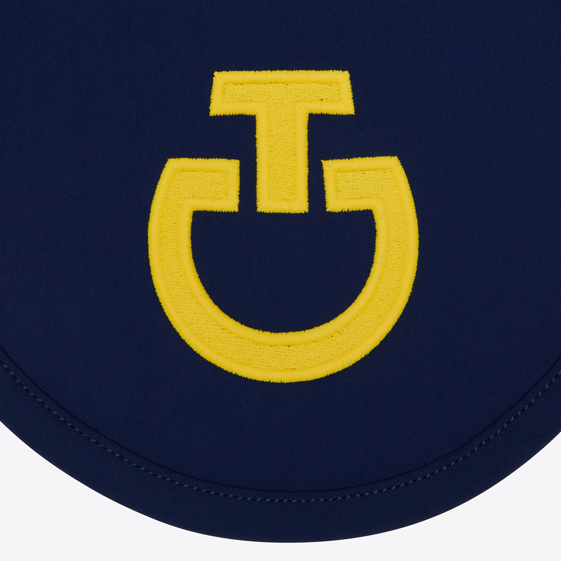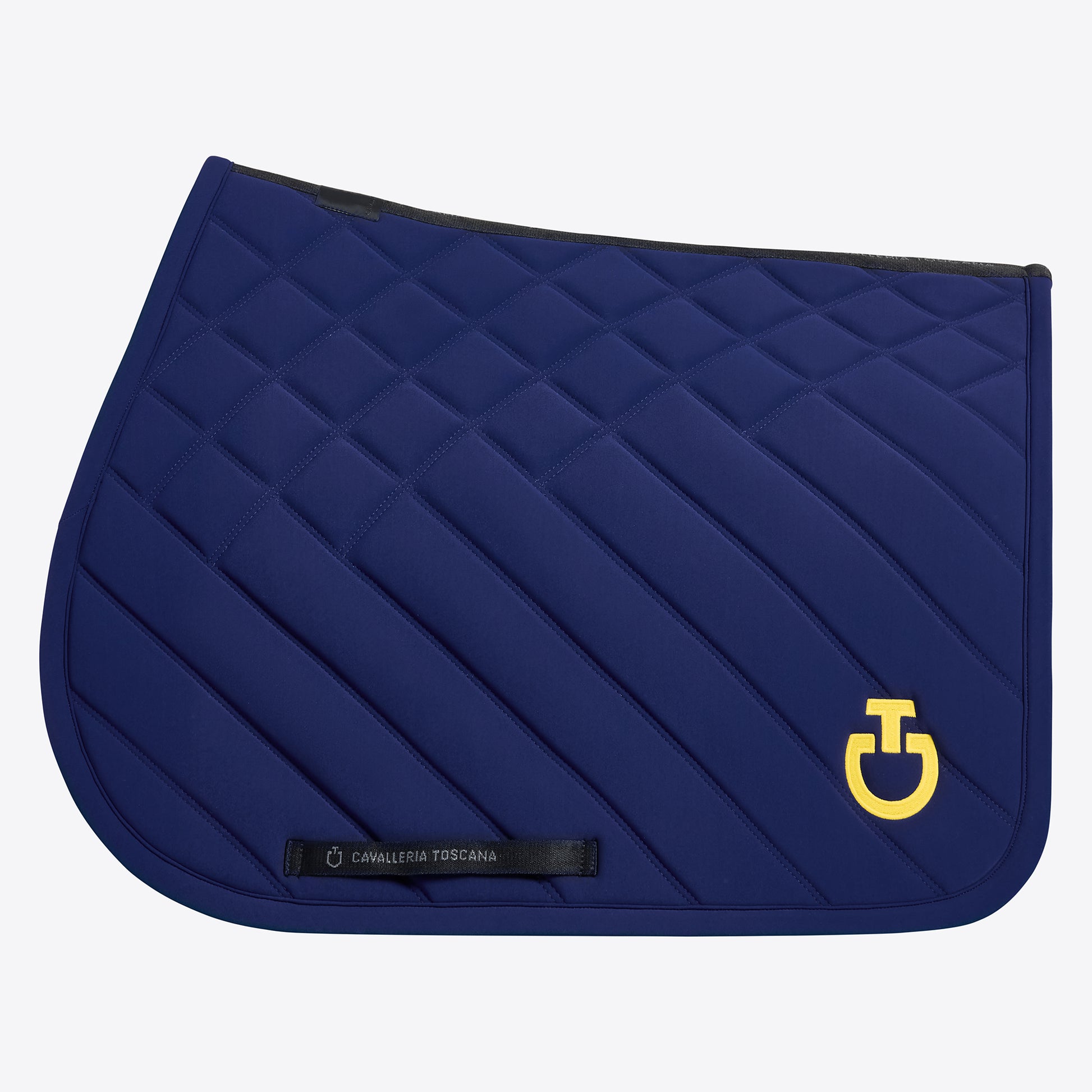 The Cavalleria Toscana jumping saddle pad is crafted to combine functionality and elegance. The diamond and line quilting not only adds an aesthetic touch but also enhances weight distribution and comfort for the horse. Made with a honeycomb technical material on the inside, it ensures optimal breathability during training or competitions. Finished with an embroidered CT logo and contrasting edges, this saddle pad is an essential accessory for riders seeking quality and sophistication.